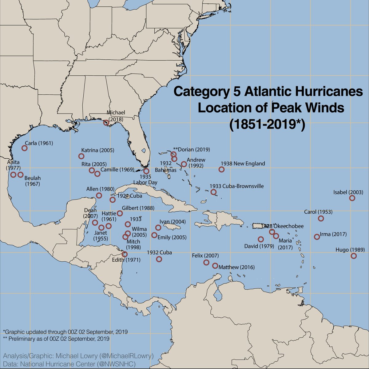 21 september 2005 hurricane rita just strengthened to a category 5 hurricane. A category 5 atlantic hurricane is a tropical cyclone that reaches category 5 intensity on the saffirsimpson hurricane wind scale within the atlantic ocean to the north of the equatorthey are amongst the strongest tropical cyclones that can form on earth and have 1 minute sustained wind speeds of over 137 knots 254 kmh. Only three hurricanes have made landfall as a category 5 hurricane since 1924.